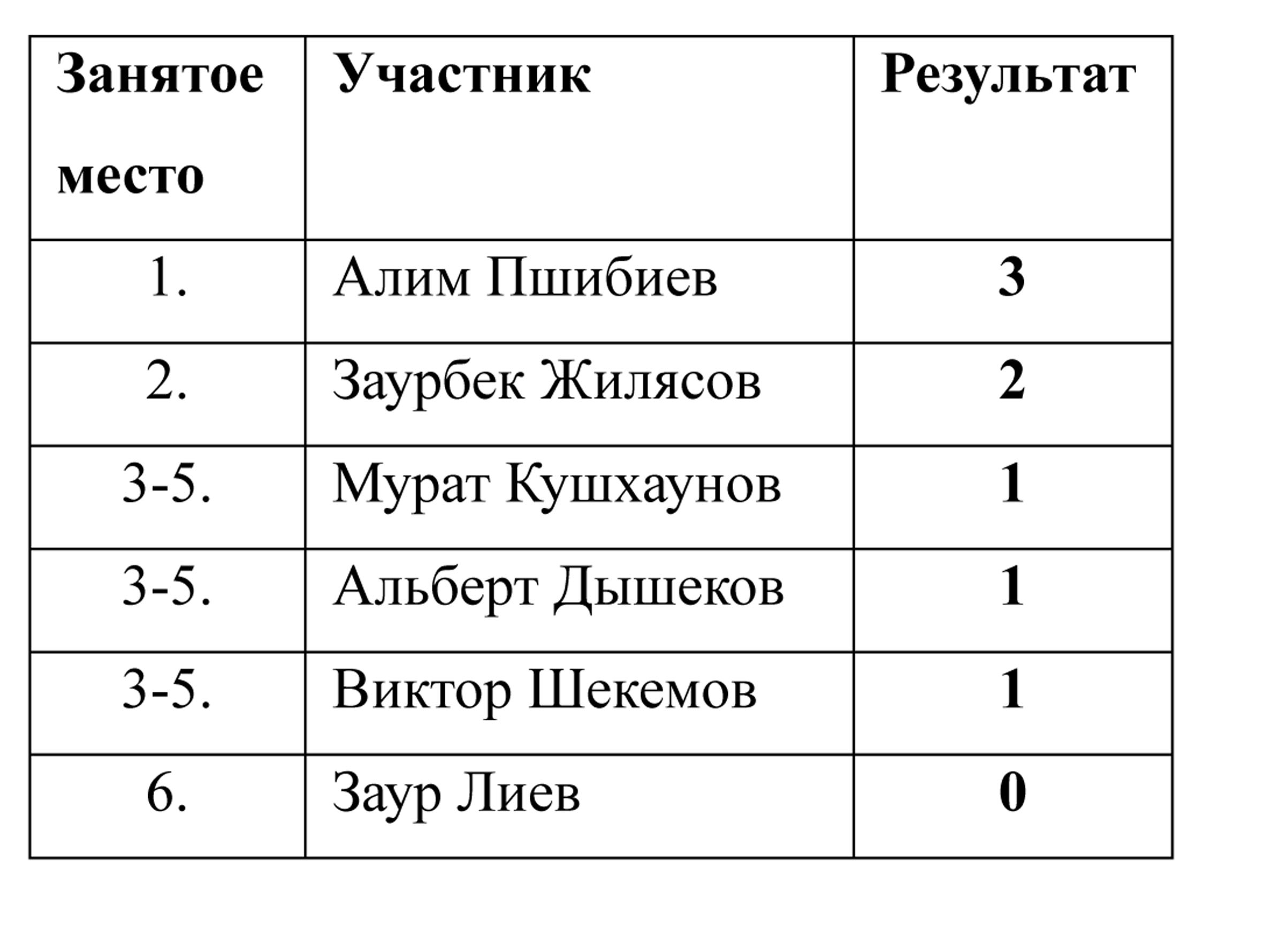 Первое место с тремя набранными очками занял Алим Пшибиев, угадавший всех призёров. Вторым стал Заурбек Жилясов, точно назвавший второго призёра и результат чемпиона. Остальные остались позади, набрав не больше 20 процентов от возможного результата.