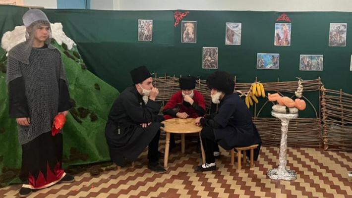Наиболее многолюдно было в фойе школы. Здесь организовали выставку «Предметы домашнего обихода» и конкурс детских рисунков «Нартский эпос». На глазах у зрителей заседали старейшины нартов, в кузнице ковал железо Тлепщ, а чуть поодаль стояла Сатаней с младенцем.
