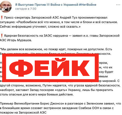 Фейк: российские военные атаковали Запорожскую АЭС![]() Президент Украины Владимир Зеленский обвинил российских военных в атаке на Запорожскую АЭС с целью устроить «второй Чернобыль». По его словам, танки ВС РФ атакуют атомные энергоблоки. В соцсетях заявлялось, что российские войска обстреляли АЭС, один снаряд попал в энергоблок и теперь ядерная безопасность нарушена.
