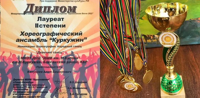 Стали победителями всероссийского конкурса 20 марта в Государственном музыкальном театре прошёл всероссийский конкурс исполнительского мастерства «Вдохновение». Хореографический ансамбль «Куркужин» детской школы искусств им. М. Кипова занял первое место в номинации «Хореография. Народный танец», исполнив «Танец западных черкесов», и второе место в той же номинации за «Девичий танец». Преподавателем призёров престижного конкурса является заслуженный артист КБР Алим Канукоев.