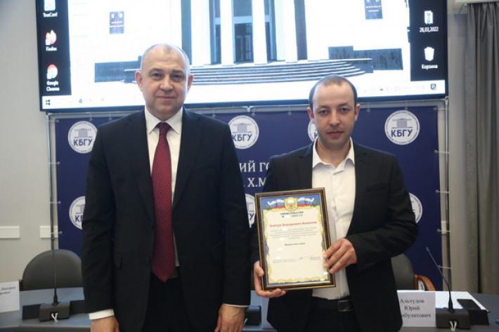Грант молодого учёного![]() Главный федеральный инспектор по Кабардино-Балкарской Республике Тимур Макоев вручил свидетельство о победе в конкурсе на право получения грантов Президента России Зейтуну Ахматову, старшему научному сотруднику кафедры теоретической и экспериментальной физики Кабардино-Балкарского государственного университета им. Х.М. Бербекова. Грантовый проект «Исследование капиллярных и электронных свойств слоистых углеродных материалов интеркалированных атомами металлов» направлен на теоретическое и экспериментальное решение отдельных задач, возникающих в физике микроструктурных систем при разработке новых материалов и технологий. Результатом выполнения проекта будет создание методов синтеза принципиально нового полимера, отвечающего всем требованиям, предъявляемым к мембранным полимерам. Оптимизация химической структуры полимера приведёт к получению материала с новыми уникальными свойствами, сочетающими наряду с высокими прочностными показателями, гидролитической стабильностью и термостойкостью, необходимую гидрофильность и повышенную растворимость. Полученные в рамках проекта результаты найдут применение при создании новых материалов для микро- и наноэлектроники на основе слоистых углеродных материалов. Развитый в рамках проекта метод изотопных маркеров позволит следить за контролем эффективности технологии и существенно снизить лучевую нагрузку на исследуемый материал.