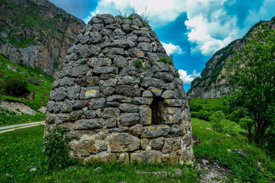 Следующий примечательный пункт путешествия – древний склеп, расположенный неподалёку от дороги к перевалу Хазни. Сведений об этом архитектурном памятнике практически нет, но выглядит он весьма примечательно. Похожих сооружений не встретишь ни у нас, ни в соседней Осетии.