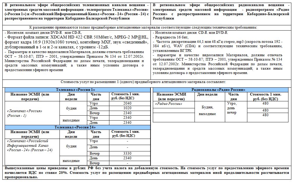 в депутаты Парламента Кабардино-Балкарской Республики шестого созыва назначенных на 08 сентября 2019 года. Филиал федерального государственного унитарного предприятия «Всероссийская государственная телевизионная и радиовещательная компания» (ВГТРК) «Государственная телевизионная и радиовещательная компания «Кабардино Балкария» уведомляет о расценках (размерах и условиях оплаты) по размещению агитационных материалов на период предвыборной кампаний по подготовке и проведению выборов депутатов Парламента Кабардино-Балкарской Республики шестого созыва назначенных на 08 сентября 2019 года в средствах массовой информации.