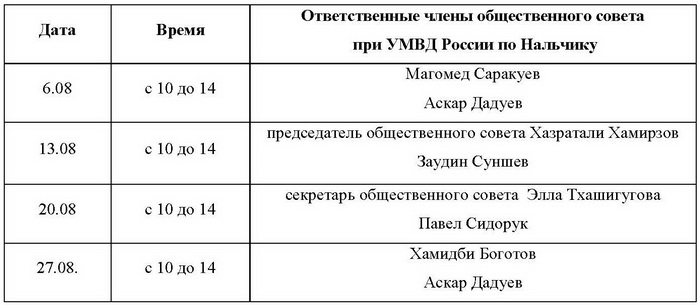 Содействие жителямПри общественном совете управления МВД России по Нальчику работает общественная приёмная, основной задачей которой является содействие жителям города в рассмотрении вопросов компетенции органов внутренних дел, укрепление взаимопонимания между обществом и силами правопорядка.