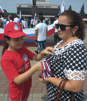 Десятиметровое полотнище молодёжь пронесла по улице Ногмова до улицы Кабардинской, где прошёл второй этап акции – раздача ленточек-триколоров прохожим. Первоначально инициаторы молодёжного патриотического мероприятия планировали провести опрос среди жителей на знание государственной символики, однако от этой идеи отказались – решили не ставить горожан в неловкое положение в случае, если они не смогут верно ответить на вопросы.