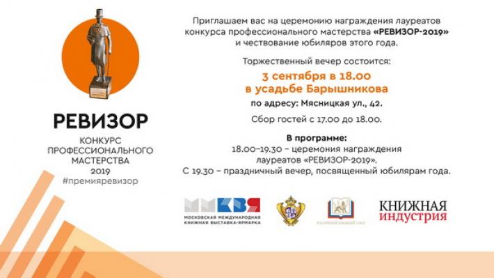 Федеральное агентство по печати и массовым коммуникациям, Российский книжный союз, генеральная дирекция международных книжных выставок и ярмарок и журнал «Книжная индустрия» проводят конкурс профессионального мастерства «Ревизор-2019» уже восьмой год. В одиннадцати номинациях определяются лучшие в книжной отрасли, в том числе в номинации «Профессионал года» – руководитель компании, редактор года, продавец года, журналист года, блогер года. Достижения редактора оцениваются по следующим параметрам: наличие серьёзных издательских проектов, грамотная работа с авторами, вклад в развитие литературного процесса в России, включение книг в списки ведущих литературных премий (в лонг- и шорт-листы).