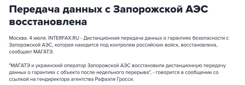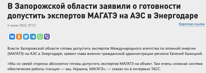 5 июля власти Запорожской области подчеркнули, что готовы допустить экспертов Международного агентства по атомной энергии (МАГАТЭ) на атомную электростанцию. Ранее МАГАТЭ сообщило, что передача данных с Запорожской АЭС восстановлена.