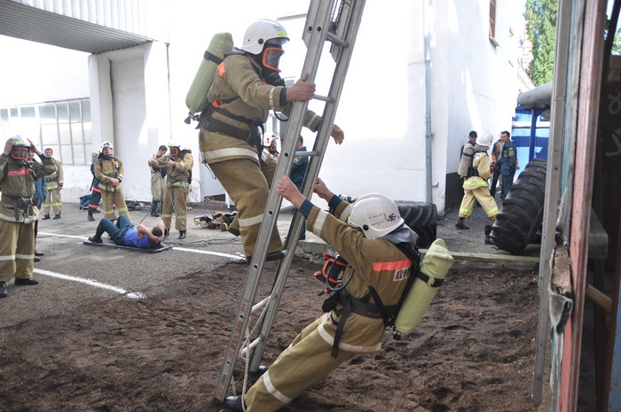 Звено газодымозащитной службы – группа, формируемая для тушения пожара в непригодной для дыхания среде. Смотр-конкурс включал теоретическую (опрос участников по билетам и проверка ведения документации по направлению служебной деятельности) и практическую (правильность и быстрота проведения боевой проверки СИЗОД, вязка спасательной петли с надеванием её на спасаемого, подъём по установленной трёхколенной выдвижной лестнице в окно третьего этажа учебной башни и боевое развёртывание от автоцистерны) части.