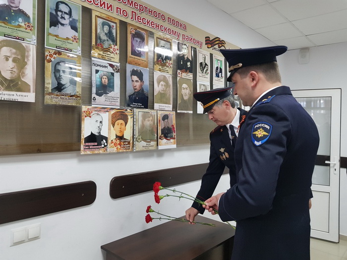 Сотрудники полиции возложили цветы к стенду героев Великой Отечественной войны и почтили их память минутой молчания.