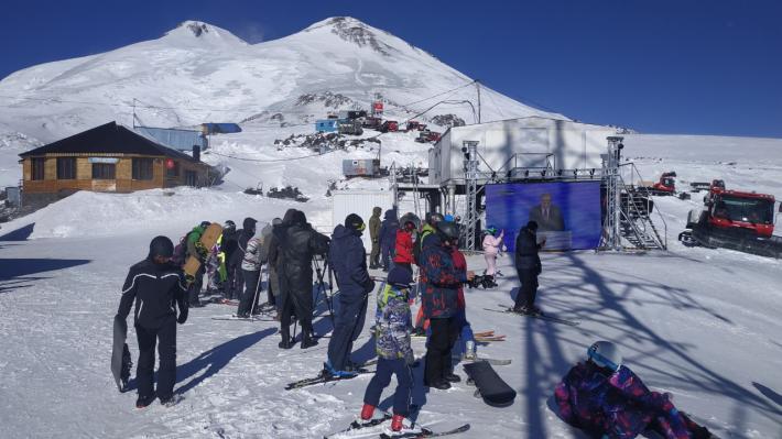 На рекордной высоте был расположен экран для просмотра послания В. Путина на склоне Эльбруса на станции «Гара-Баши» – на высоте 3847 метров над уровнем моря. Выше, чем наши лыжники и сноубордисты, послание видели только космонавты.