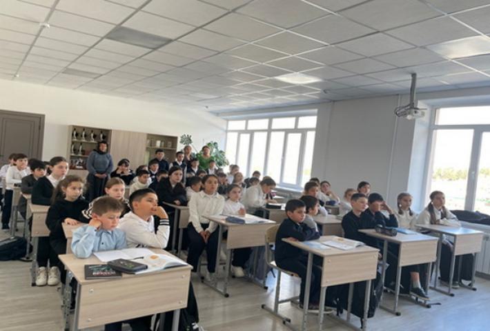 Методист по экологическому просвещению Мадина Валентиновна Жашаева прочитала учащимся доклад, затем им была показана презентация о флоре и фауне национального парка. Школьники с интересом послушали и обсудили полученную информацию.