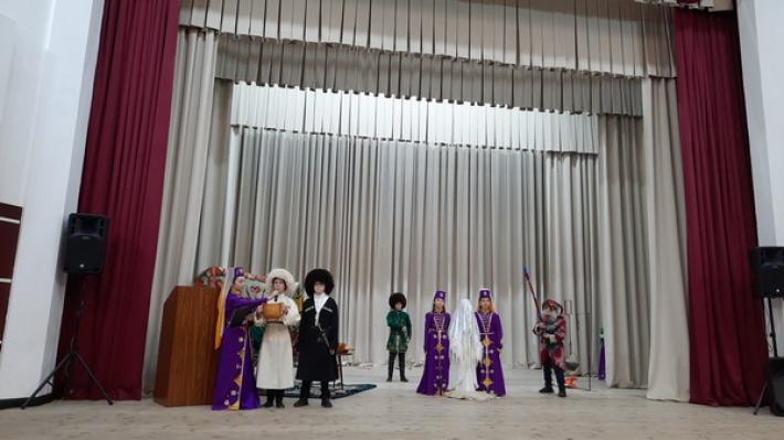 Инсценировки балкарского свадебного обряда «Баш ау алгъан адет» (снятие платков с невесты) подготовили команды школы №4 г. Чегем, школы №1 с. Верхняя Балкария Черекского района и школы №4 им. Т.М. Энеева с. Кёнделен, а ребята из Центра развития творчества детей и юношества им. М.Х. Мокаева рассказали о легендарном охотнике и бойце в постановке «Рождение воина Тотура».