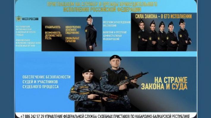 Управление Федеральной службы судебных приставов по КБР приглашает граждан на службу в территориальный орган принудительного исполнения Российской Федерации. Набор кандидатов идёт на вакантные должности: судебный пристав-исполнитель, дознаватель, судебный пристав по обеспечению установленного порядка деятельности судов.