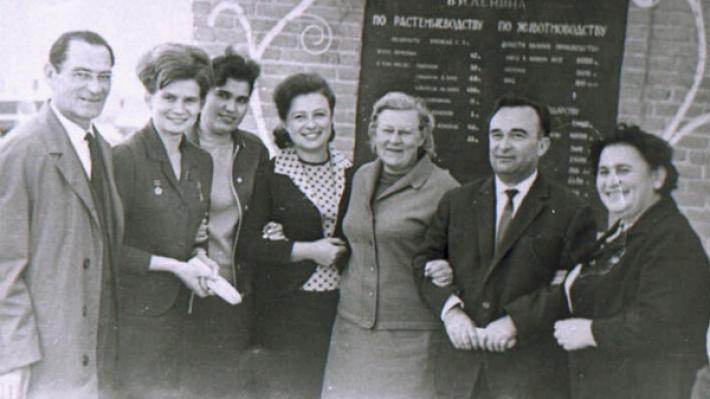 Эта фотография датирована 5 октября 1966 года и сделана в селении Аргудан. На снимке первая женщина-космонавт Валентина Терешкова, руководители Кабардино-Балкарии и Северной Осетии Тимбора Мальбахов и Билар Кабалоев, секретарь Президиума Верховного Совета КБАССР Фаина Арсаева.