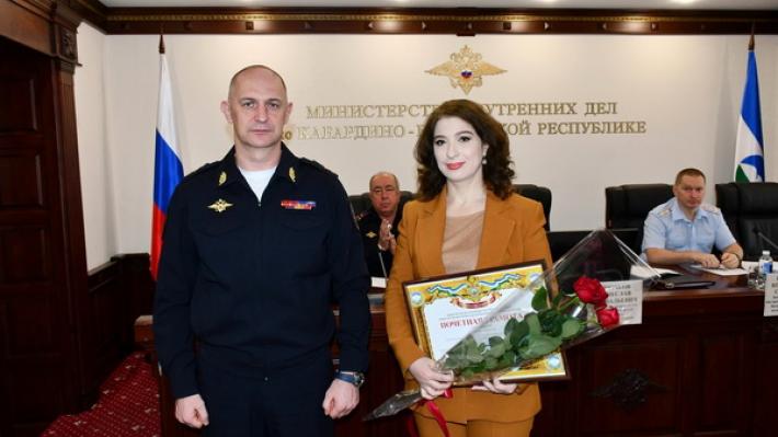 За активное взаимодействие с МВД по КБР в вопросах освещения деятельности ведомства министр внутренних дел по КБР Вячеслав Крючков вручил почётную грамоту ведомства начальнику управления по связям с общественностью и взаимодействию со средствами массовой информации аппарата Парламента КБР Любе Батыровой.