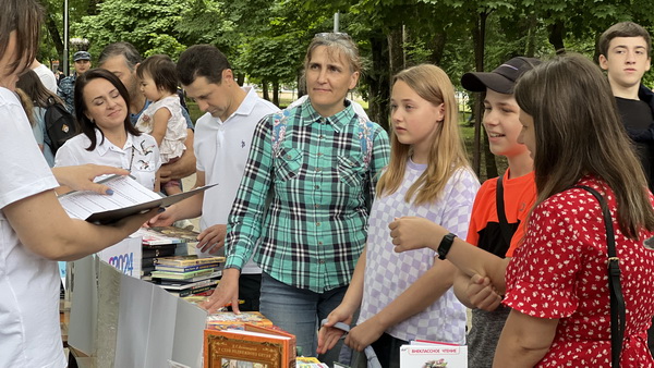 Атажукинский парк – центр притяжения для семей с детьми разных возрастов. Именно здесь специалисты библиотеки организовали «Книжный бульвар», девизом которого стало название книжной выставки «Семью сплотить сумеет мудрость книг». На ней были представлены издания, которые вызвали большой интерес у детей и родителей и которые можно почитать всем вместе: детективные истории для детей, мировая классика, интересные сериальные издания о знаменитых исторических личностях, энциклопедии.
