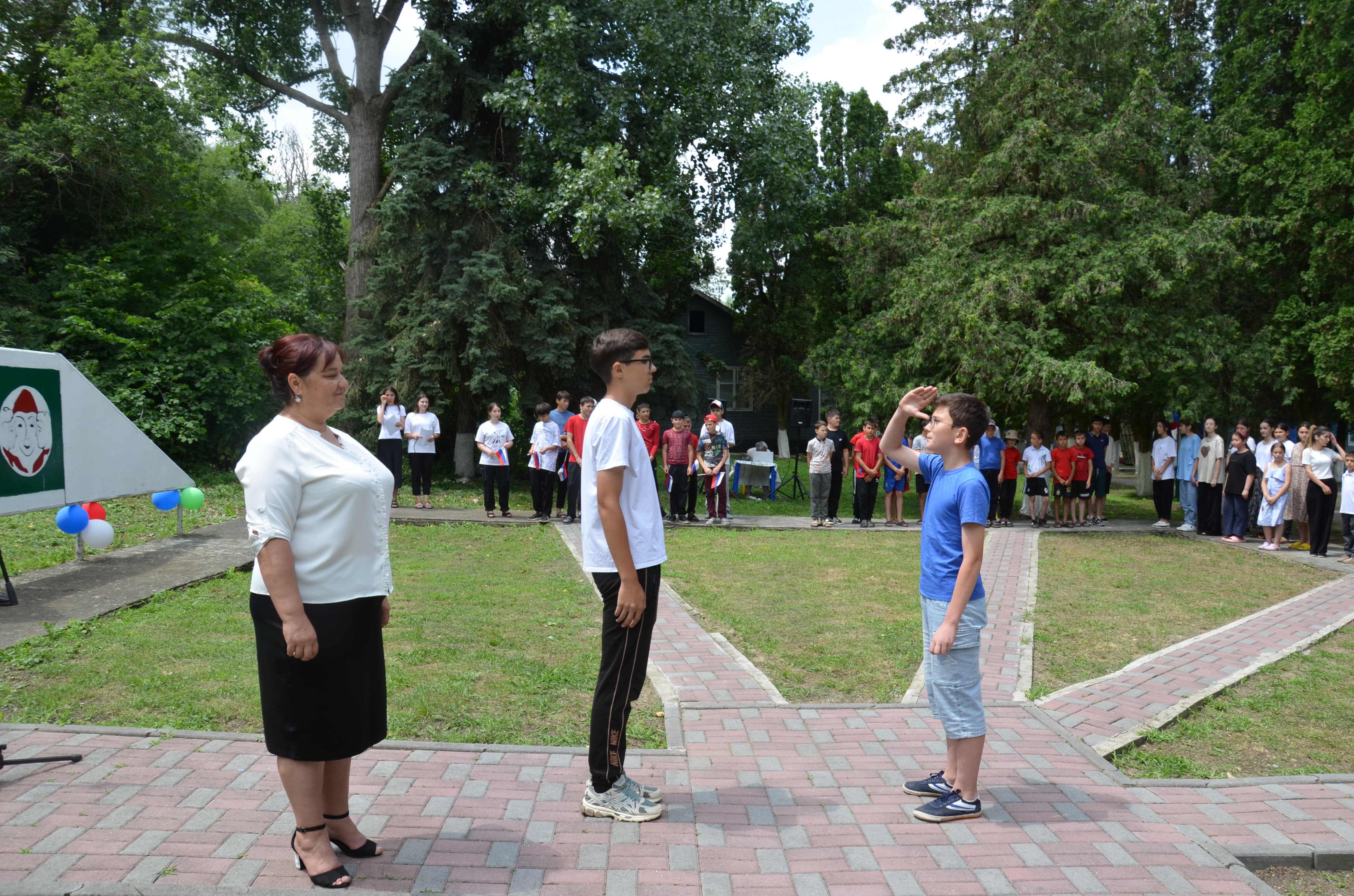 В течение первой недели отряды готовились к торжественной линейке, к сдаче рапорта вожатым. И вот, сегодня, отряды в сопровождении своих вожатых, маршируя на первую линейку, представили свои названия и девизы. А началось мероприятие с торжественной церемонии поднятия флага под гимн Российской Федерации. У дружины лагеря «Тимуровцы» девиз звучал так: «Служить добру и справедливости, быть полезным Родине. Будь готов!».