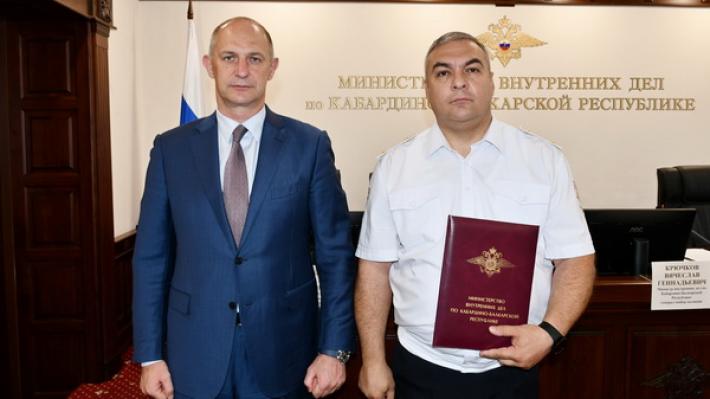 Министр внутренних дел по КБР Вячеслав Крючков зачитал приветственный адрес и передал слова поздравления заместителя министра внутренних дел Российской Федерации Александра Горового.