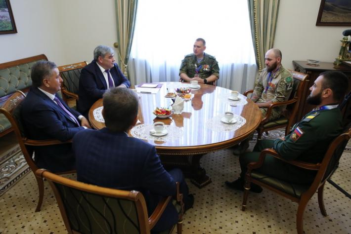 Глава КБР Казбек Коков встретился сегодня с ветеранами специальной военной операции Валентином Вороновым, Заурбеком Мазлоевым, Асланом Халиловым, руководителем филиала государственного фонда «Защитники Отечества» Муаедом Дадовым, директором Спортивно-адаптивной школы Минспорта КБР Александром Кулюшиным. В силу служебных обстоятельств не смог принять участие во встрече Магомед Базиев.