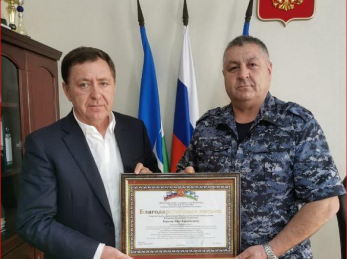 От имени руководителя Управления Росгвардии по КБР заместитель начальника ведомства Мурат Мешев вручил благодарственное письмо главе администрации Чегемского района Юре Борсову за активное взаимодействие и участие в мероприятиях по патриотическому воспитанию молодёжи.