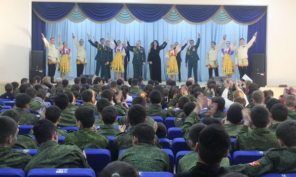 Ансамбль песни и пляски Северо-Кавказского округа войск Национальной гвардии РФ выступил перед воспитанниками кадетской школы-интерната в доме культуры села Атажукино.