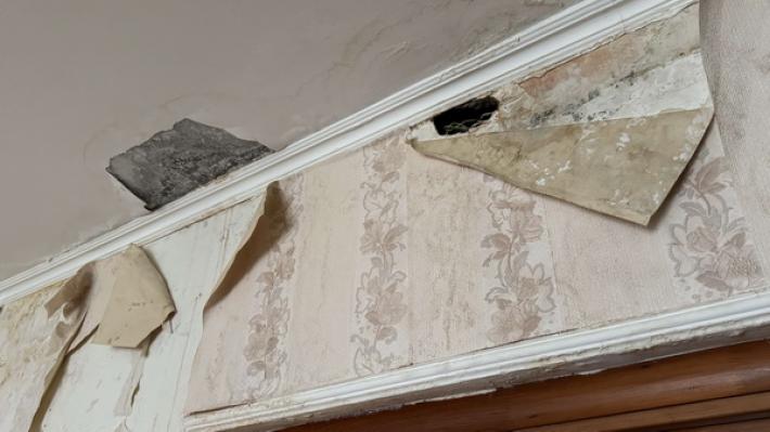 На верхних этажах всех трёх подъездов многоквартирного дома протекает крыша, а в плитах перекрытий уже появились серьёзные повреждения. По оценкам специалистов влага, попадающая в бетон, при замерзании расширяется и разрушает структуру плит. Без срочных мер со временем бетонные перекрытия могут обрушиться.