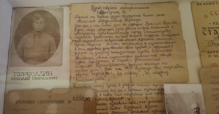 Вот что написали с фронта горюющей матери товарищи её сына: «Ваш сын, а наш боевой друг по оружию Николай Пересада в дни, когда озверелый враг рвался со своей техникой к цветущему промышленному городу Сталинграду, стремясь захватить его, тем самым создать плацдарм для окружения и взятия нашей красной столицы, сердца страны – Москвы, он стойко и мужественно встал своей грудью, с оружием в руках на защиту исторического города Сталина. Николай своим мужеством удивлял нас, творя чудеса храбрости в борьбе с фашистской нечистью. Правительство высоко оценило его боевые дела – Ваш сын Н.Г. Пересада был награждён медалью «За отвагу». Указом Президиума Верховного Совета СССР от 22 декабря 1942 г. награждён медалью «За оборону Сталинграда».