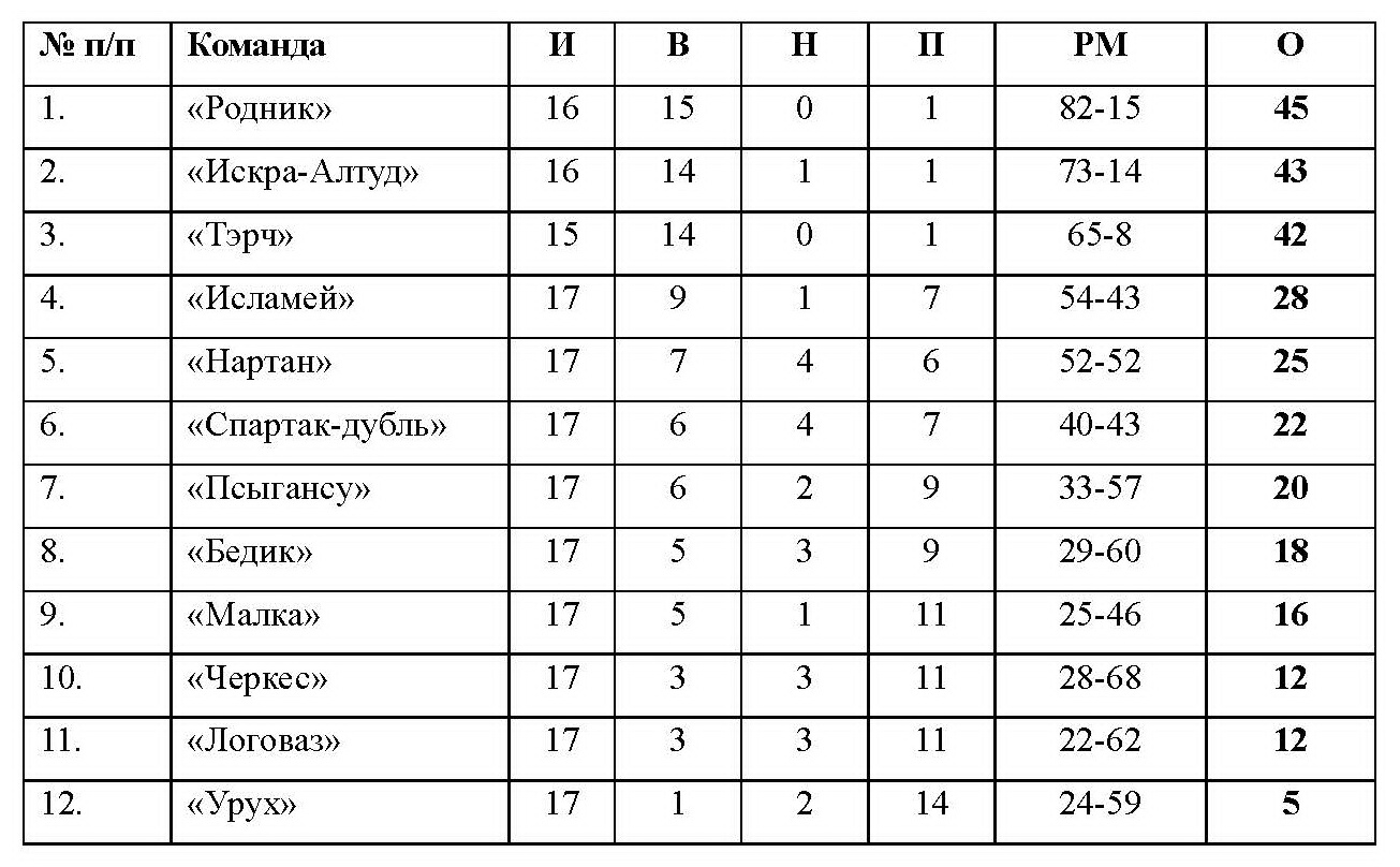 Таблица чемпионата КБР среди команд высшего дивизиона