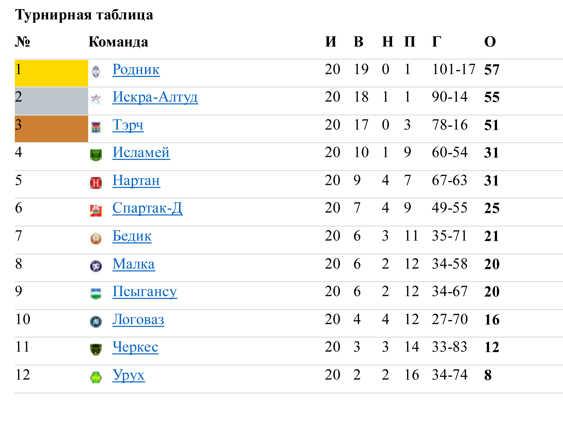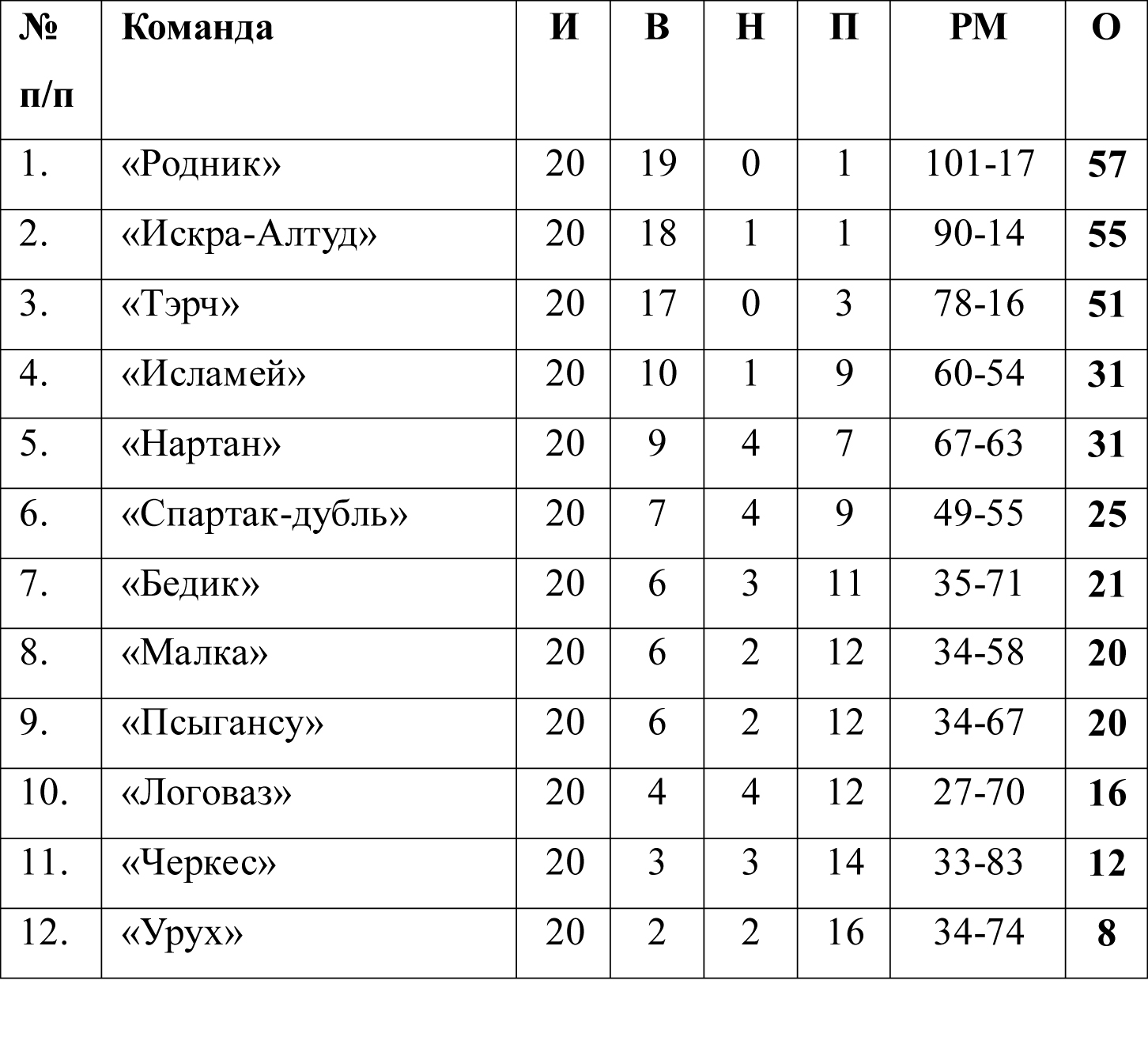 Таблица чемпионата КБР Среди команд высшего дивизиона. Положение на 19 сентября