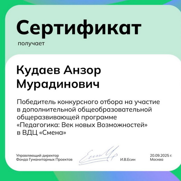 За право попасть на программу боролись более 400 школьников – учеников 6-11 классов из 72 регионов России. По результатам отбора победителями стали 200 человек, в число которых вошёл и представитель Кабардино-Балкарской Республики Анзор Кудаев. Анзор учится в 10 классе средней школы № 2 городского поселения Терек. Победа в престижном общероссийском конкурсе открывает ему возможность стать участником уникальной образовательной программы, которая пройдёт во всероссийском детском центре «Смена» с 31 октября по 13 ноября.