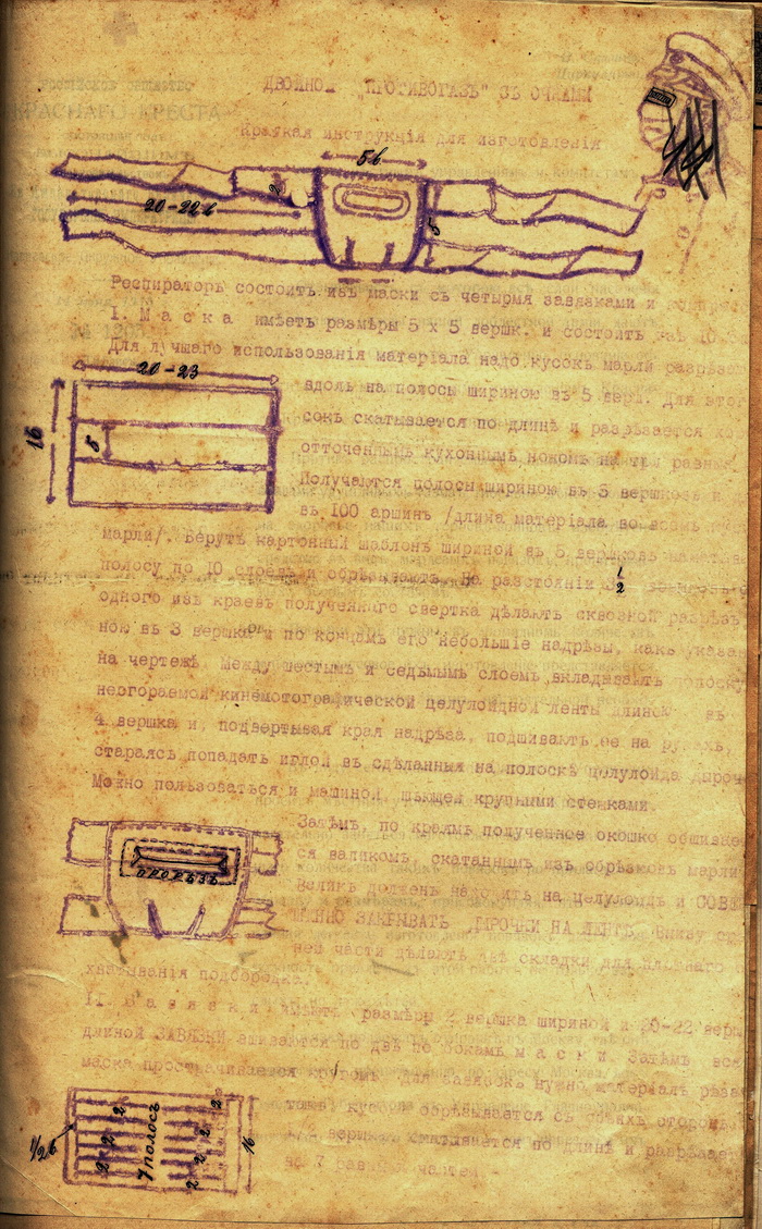 I. Маска имеет размеры 5×5 вершков (вершок равен 4,4 см – авт.) и состоит из 10 слоёв. Для лучшего использования материала надо кусок марли разрезать вдоль на полосы шириною в 5 вершков. Для этого кусок скатывается по длине и разрезается хорошо отточенным кухонным ножом на три равные (части). Получаются полосы шириною в 5 вершков и (длиною) в 100 аршин (длина материала во всём куске марли). Берут картонный шаблон в 5 вершков, наматывают полосу по 10 слоёв и обрезывают. На расстоянии 3 ½ вершков от одного из краёв полученного свёртка делают сквозной разрез длиною в 3 вершка и по концам его небольшие надрезы, как показано на чертеже. Между шестым и седьмым слоем вкладывают полоску несгораемой кинематографической целлулоидной ленты длиною в 4 вершка и, подвёртывая края надреза, подшивают её на руках, стараясь попадать иглой в сделанные в полоске целлулоида дырочки. Можно пользоваться и машиной, шьющей крупными стежками.