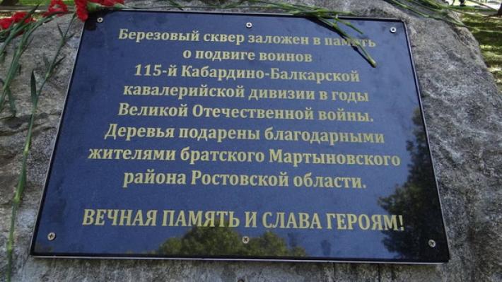 Символично, что мемориальная доска установлена в сквере среди берёз, привезённых из братского Мартыновского района Ростовской области, где свято чтят память о подвиге наших земляков и ухаживают за братскими могилами.