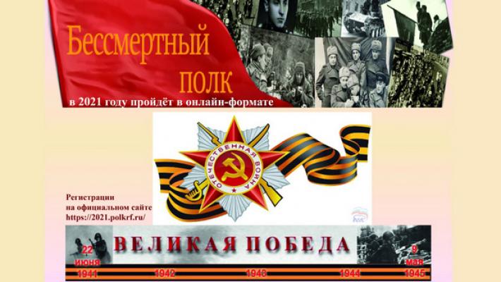 В 2020 году общероссийская акция "Бессмертный полк" впервые полностью прошла в дистанционном формате в связи с пандемией коронавируса. Трансляция шествия «Бессмертный полк онлайн» проводилась на сайте polkrf.ru, а также в социальных сетях. «В прошлом году мы рассчитывали, что в онлайн-шествие поступит порядка 200 тысяч заявок, но поступило более 3 млн заявок. В связи с этим трансляция продолжалась 20 дней. В этом году мы меняем технологический подход и распределяем потоки шествия по регионам. Теперь все трансляции пройдут в один день 9 мая. Каждый субъект получит свой поток трансляции», - добавила сопредседатель центрального штаба движения «Бессмертный полк России» Елена Цунаева.