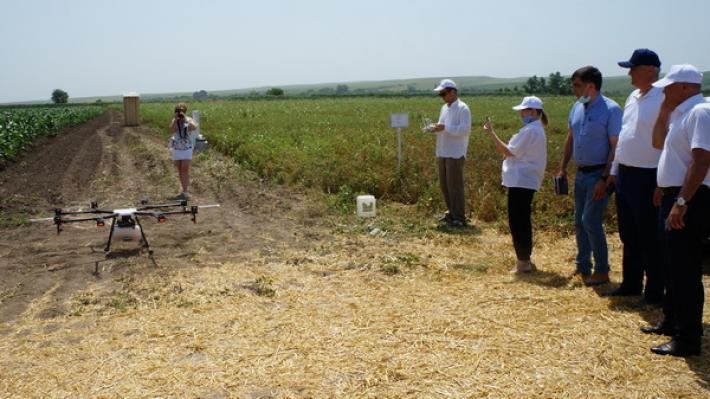 В практической части «Дня поля» впервые прошла демонстрация работы дрона по обработке посевов кукурузы от хлопковой совки.
