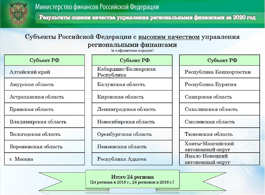 Кабардино-Балкария второй год подряд входит в число лидеров по управлению региональными финансами![]() Министерством финансов России опубликован рейтинг российских регионов по качеству управления финансами за 2020 год. 85 территорий поделены на три группы, в первую попали 24 региона с «высоким качеством управления региональными финансами», во вторую — 44 с «надлежащим качеством управления региональными финансами», в третьей оказались 17 субъектов с «низким качеством управления региональными финансами».