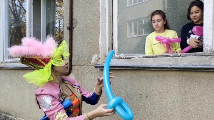 Гостей в этот тёплый осенний день ждали с нетерпением – у каждого окна собрались дети, радостно приветствующие сказочных персонажей. Для каждого из них аниматоры нашли добрые слова, постарались приободрить и развеселить. А уж передача подарков выглядела невероятно трогательно – ребят одинаково порадовали и фрукты, и фигурки из шариков, создаваемые прямо у них глазах.