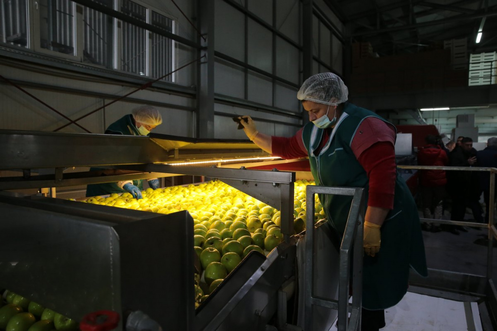Гости также осмотрели новое фруктохранилище – современный холодильный комплекс общей мощностью хранения 25 тысяч тонн. Управляемая электроникой инновационная система обеспечивает хранение яблок до одного года. Вице-премьеру показали организацию работы в сортировочном цеху, где используются две линии товарной обработки производительностью 10 и 24 тонн в час. Линии обеспечивают автоматический отбор яблок в соответствии с заданными параметрами цвета, веса и размера. Всего на обоих предприятиях трудоустроено 250 человек.