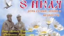 День семьи, любви и верности отмечают в России 8 июля. Он приурочен к Дню памяти православных святых Петра и Февронии Муромских и официально установлен как светский праздник указом Президента Российской Федерации.