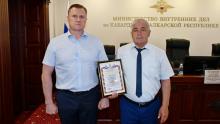 В торжественной обстановке министр внутренних дел по КБР Василий Павлов поздравил председателя региональной общественной организации ветеранов органов внутренних дел КБР Муаеда Пихова.