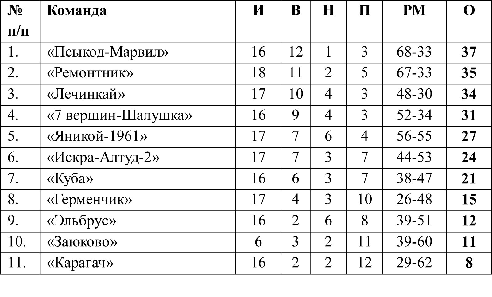 Таблица чемпионата КБР среди команд первого дивизиона.