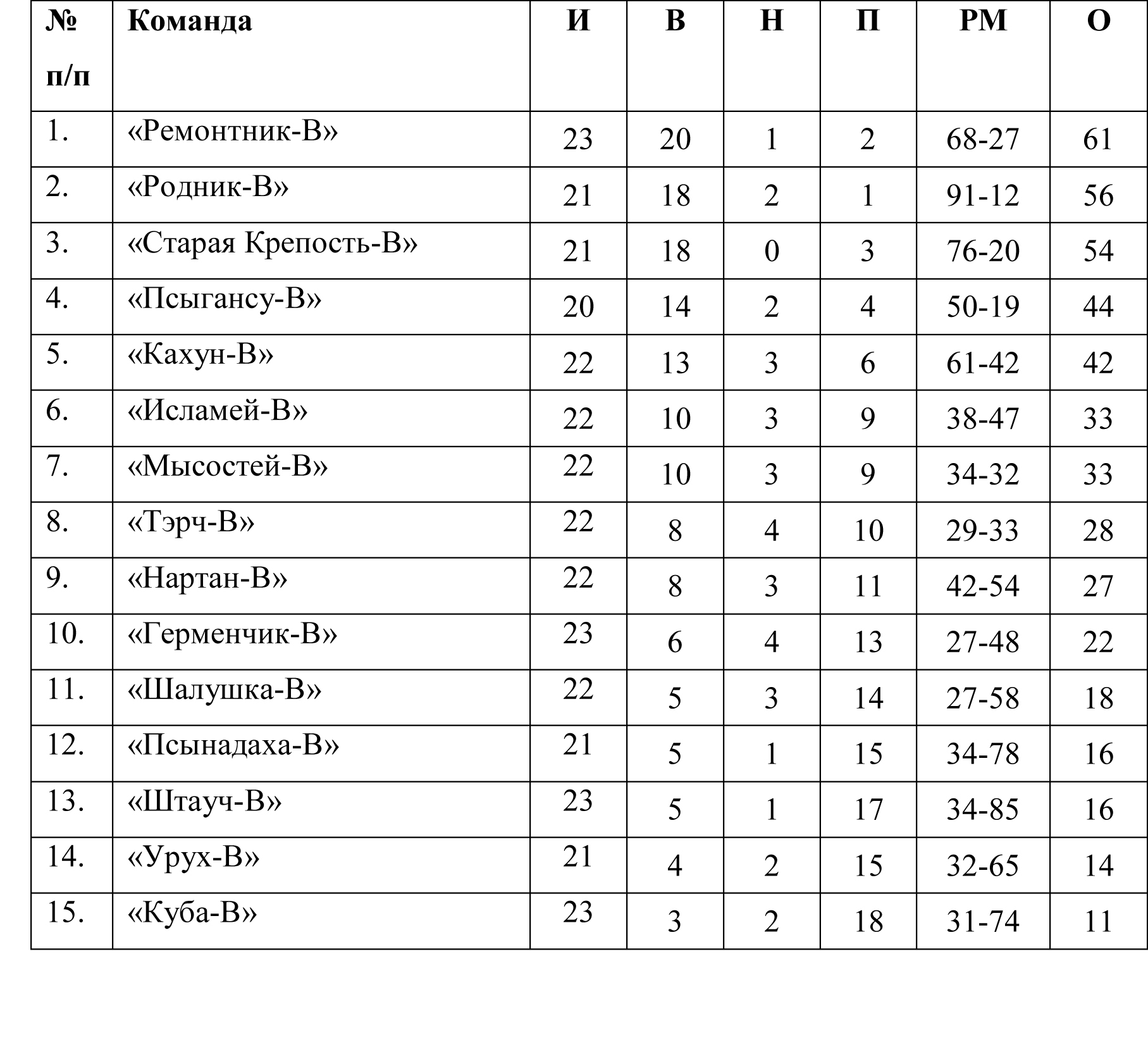 Таблица чемпионата КБР среди ветеранских команд высшего дивизиона