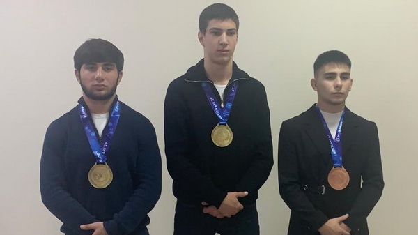 На снимке слева направо: победитель Первенства мира среди юниоров (18-20 лет) Амир Аппаев, победитель Первенства мира среди юношей (14-15 лет) Ибрагим Кумышев, призёр Первенства мира среди юношей (16-17 лет) Амир Шурдумов.