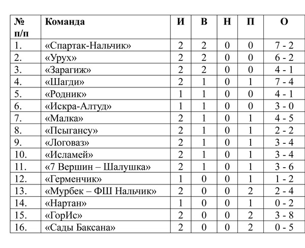 Таблица зимнего чемпионата КБР среди команд высшего дивизиона