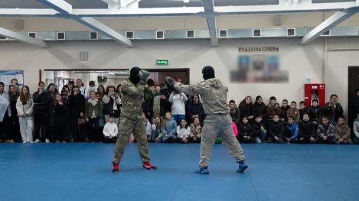 В спортивном зале бойцы провели мастер-класс по рукопашному бою, а юные спортсмены продемонстрировали приёмы самообороны.