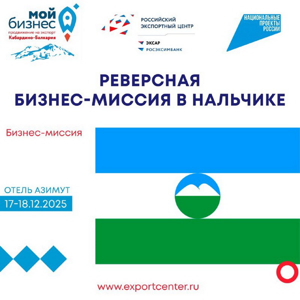 Реверсная бизнес-миссия17-18 декабря в отеле «Азимут» в Нальчике пройдёт реверсная бизнес-миссия, организует которую Центр поддержки экспорта КБР при содействии республиканского Министерства экономического развития, в которой примут участие руководители и представители компаний из Ирана, Кыргызстана и Казахстана, а также крупные производители из Кабардино-Балкарии.