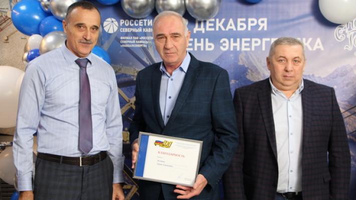 130 специалистов за различные достижения в профессиональной деятельности отмечены отраслевыми, ведомственными, корпоративными и региональными наградами. Благодарность Министерства энергетики России объявлена старшему мастеру Нальчикской группы подстанций Аскеру Кочесокову и электромонтёру службы высоковольтных линий Максиму Мельникову. Ещё четыре энергетика отмечены благодарностью ПАО «Россети»: начальник службы производственного планирования филиала Наталья Супрун, начальник производственно-технического отдела Нальчикских городских электрических сетей Артур Борукаев, начальник Нальчикской группы подстанций Анзор Гурижев и электрослесарь по ремонту оборудования распределительных сетей Рамазан Мисиров. За добросовестный труд на доску почёта «Россети Северный Кавказ» занесены начальник Баксанских районных электрических сетей Эльдар Бориев и электрослесарь по ремонту оборудования распределительных устройств Рамазан Мисиров. Кроме того, отличившиеся специалисты отмечены почётными грамотами и благодарностями «Россети Северный Кавказ», объединения работодателей электроэнергетики «ЭРА России», Парламента, Правительства, министерства промышленности, энергетики и торговли Кабардино-Балкарии, администрации г. о. Нальчик и филиала «Каббалкэнерго».