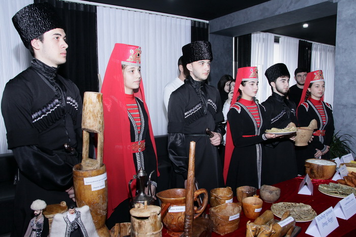 Республиканский дом молодёжи на один день превратился в масштабную площадку с национальным колоритом – в фойе муниципалитеты развернули национальные подворья с традиционными угощениями титульных народов нашей республики. Высокие башни блинов, ароматные щи, гусь по-терски, пышные, румяные лакумы с копчёным сыром, хычины – такие угощения ждали участников праздничной программы, посвящённой открытию Года единства народов России. Звонкие голоса исполнительниц в ярких красных сарафанах привлекают посетителей к подворью Майского района – директор дома культуры «Россия» г. Майского Мария Лутай приехала на праздник с солистками двух коллективов хорового пения.