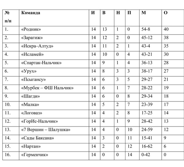 Таблица зимнего чемпионата КБР