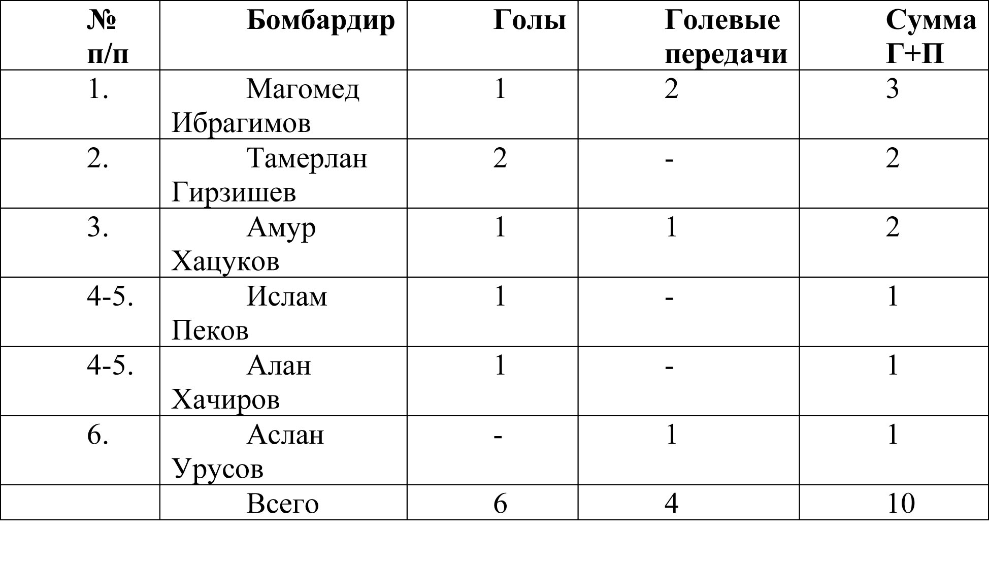 Звание лучшего бомбардира на промежуточном финише застолбил за собой другой новичок команды - Магомед Ибрагимов. Он, как и Амур Хацуков, отметился результативностью в обоих матчах, тем самым подтвердив лестные оценки, которые выдавались ему авансом перед стартом чемпионата.