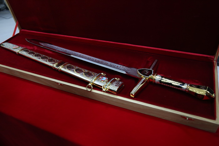 На обоюдоостром клинке виден растительный орнамент и дарственная надпись: «Городу воинской славы Нальчику». На другой стороне клинка высечены знаменитые слова Александра Невского: «Кто с мечом к нам придет, тот от меча и погибнет».
